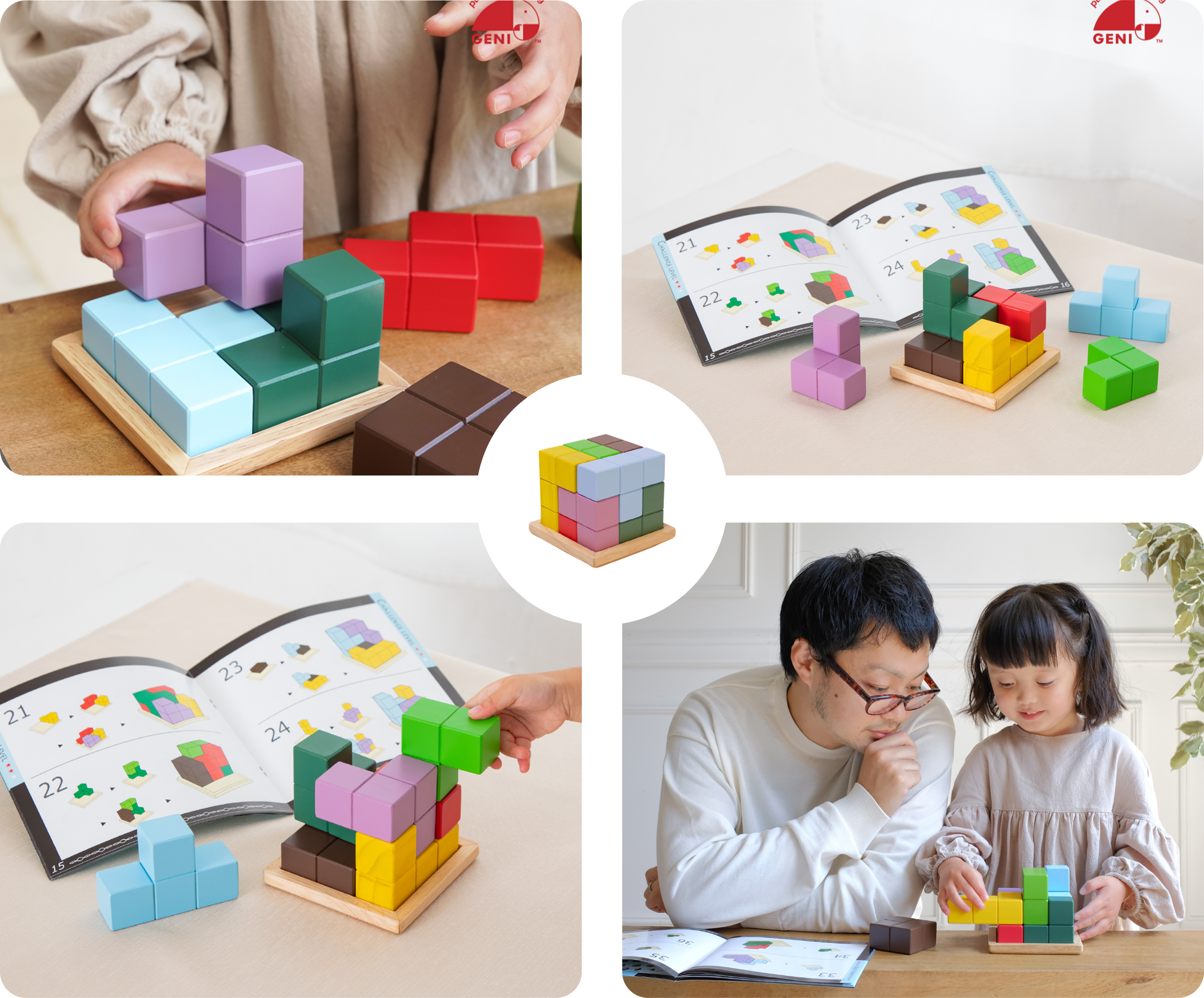 Use the seven color-coded wooden blocks to complete the perfect cube on the supplied base.